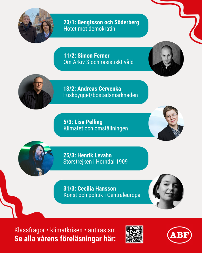 Lisa Pelling föreläser om sina cirka 200 samtal med människor från småorter och landsbygden, ofta föremål för debatt men sällan hörda. De bor i områden med knappa ekonomiska resurser men rika på naturtillgångar och erfarenheter av omvälvande förändringar, som omställningar från bruksorter till turistorter. Nu står dessa bygder inför klimatomställningen. Hur kan deras erfarenheter tas tillvara och omställningen uppfattas som rättvis? ABF-huset, 5 mars kl. 18.00-19.30.