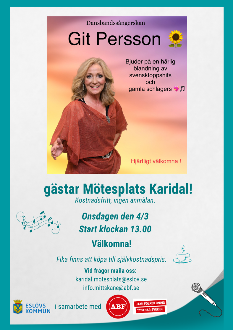 Git Persson gästar Mötesplats Karidal onsdagen den 4 mars, klockan 13.00. Kostnadsfritt, ingen anmälan. Fika finns att köpa till självkostnadspris. Välkomna!