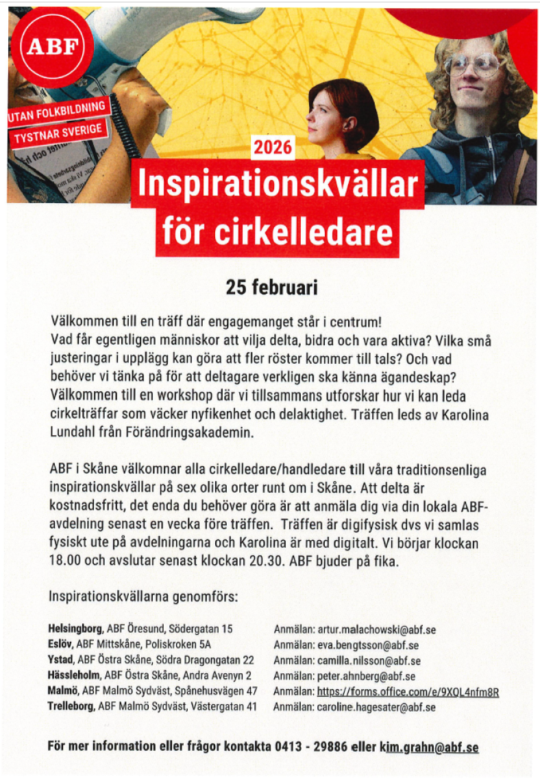 Välkommen till en träff där engagemanget står i centrum. Vad får egentligen människor att vilja delta, bidra och vara aktiva? ABF i Skåne välkomnar alla cirkelledare/handledare till våra traditionsenliga inspirationskvällar på sex olika orter runt om i Skåne. För mer information eller frågor, kontakta: 0413-29886 eller kim.grahn@abf.se