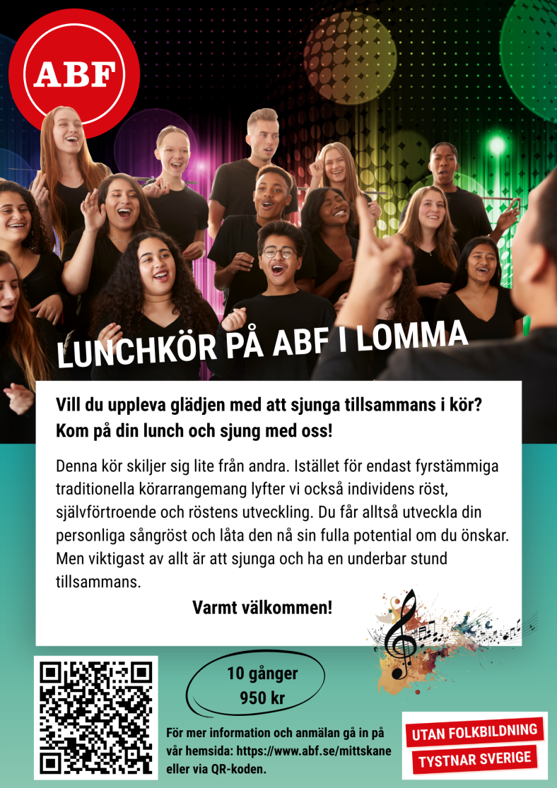 Vill du uppleva glädjen med att sjunga tillsammans i kör? Kom på din lunch och sjung med oss! Du får även chansen att utveckla din individuella sångröst då ledaren jobbar med sångutveckling inte bara som kören i sin helhet utan även utifrån individernas röst.