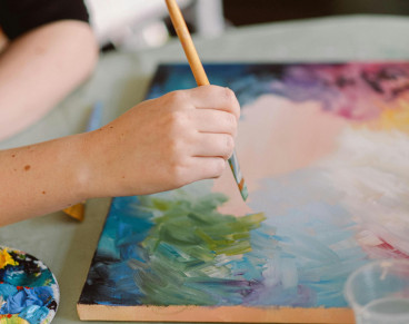Du väljer själv vilket område du vill fördjupa dig i efter genomgången som tar ca en timme. Man kan måla lager på lager eller använda färdiga mallar för färgcirklar och/eller testa att arbeta mer abstrakt med hjälp av mallar som Helen har förberett.