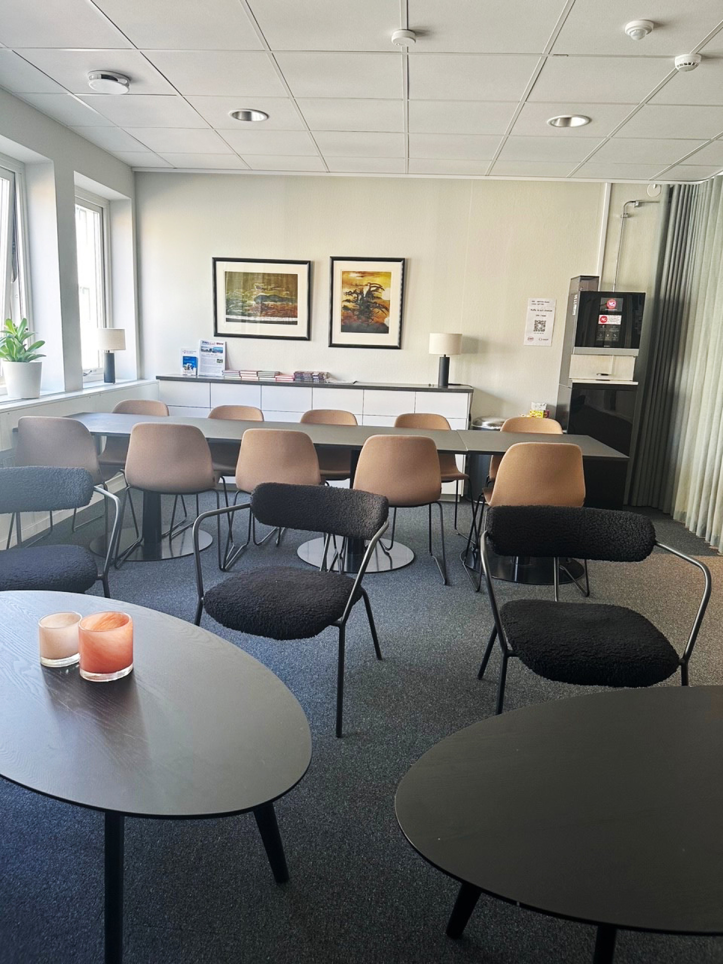 • Loungen är trevligt inredd med soffor och fåtöljer. Den har fasta sittplatser för 20 personer men fler får plats vid behov. Här finns också kaffemaskin.