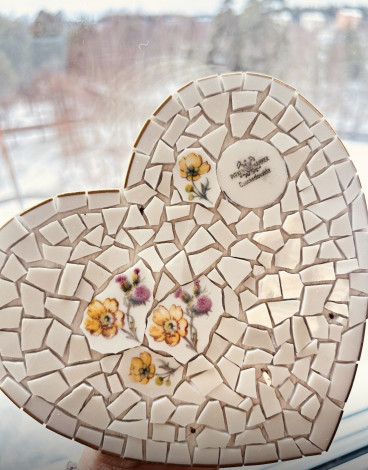 Ta med dig: två stora nystan vitt ullgarn för att göra fransar på din hjärtevärmare. Det går bra att använda restgarner som man gjorde i gammalt bruk.