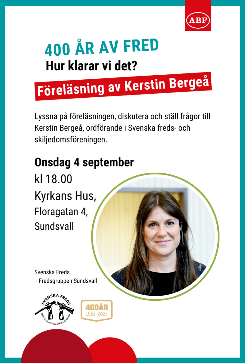 Onsdag 4 september kl 18.00 på Kyrkans Hus i Sundsvall föreläser Kerstin Bergeå. Kom och lyssna, diskutera och ställ frågor. Lokal arrangör i samarbete med ABF är Fredsgruppen i Sundsvall